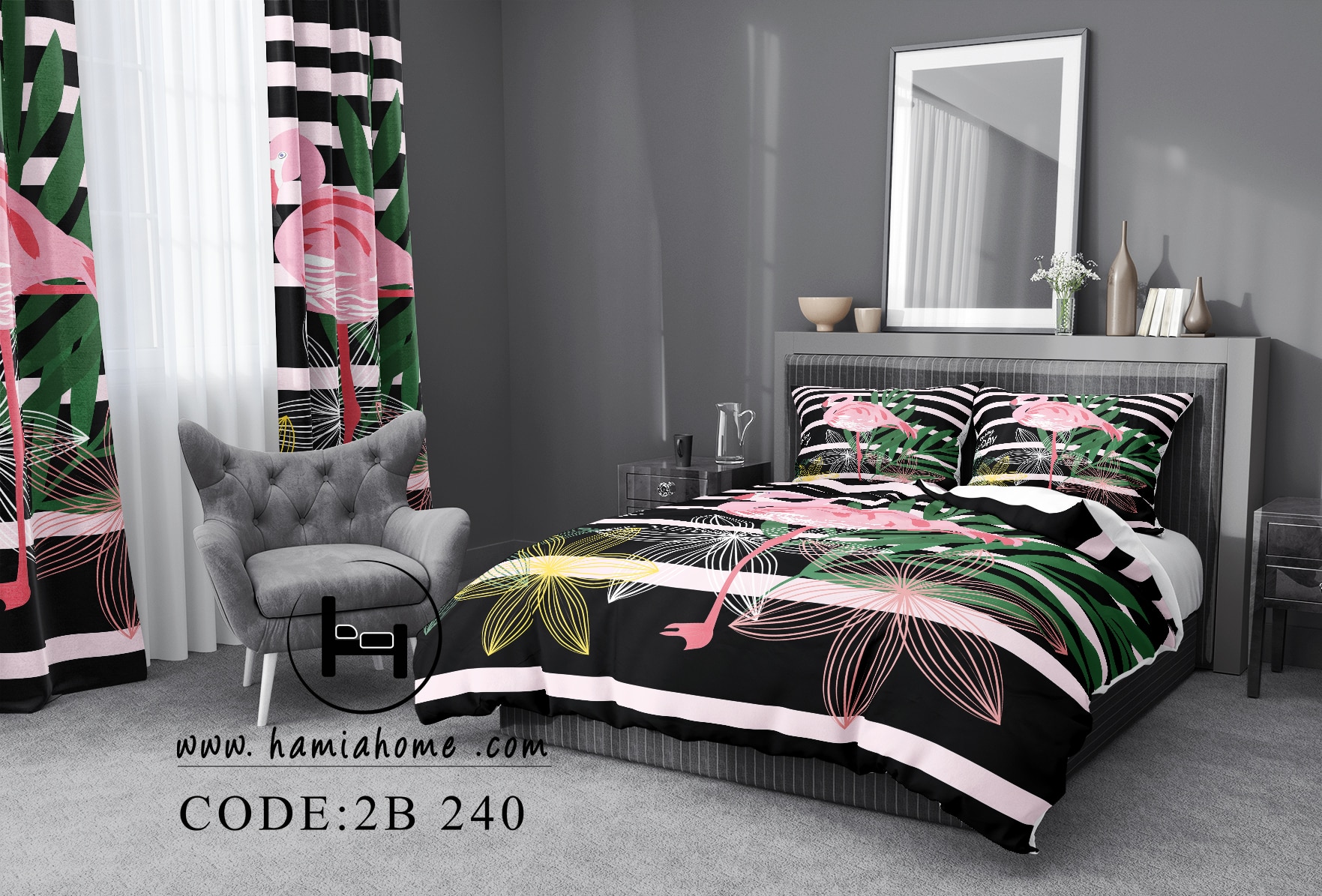 روتختی طرح فلامینگو با پسزمینه راهراه مشکی و صورتی و نقش فلامینگو صورتی بزرگ و برگهای سبز گرمسیری، جلوهای متفاوت و چشمگیر به سرویس خواب شما میبخشد. ترکیب رنگهای شاد و مدرن، انرژی تازهای به اتاق خواب میدهد و انتخابی ایدهآل برای دوستداران طرحهای خاص است.
